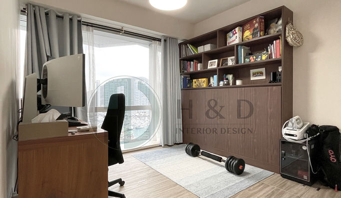 多功能用途房,以全地台設計提供大量收納位置,再將書架搭配摺疊床,既節省空間同時招待客人